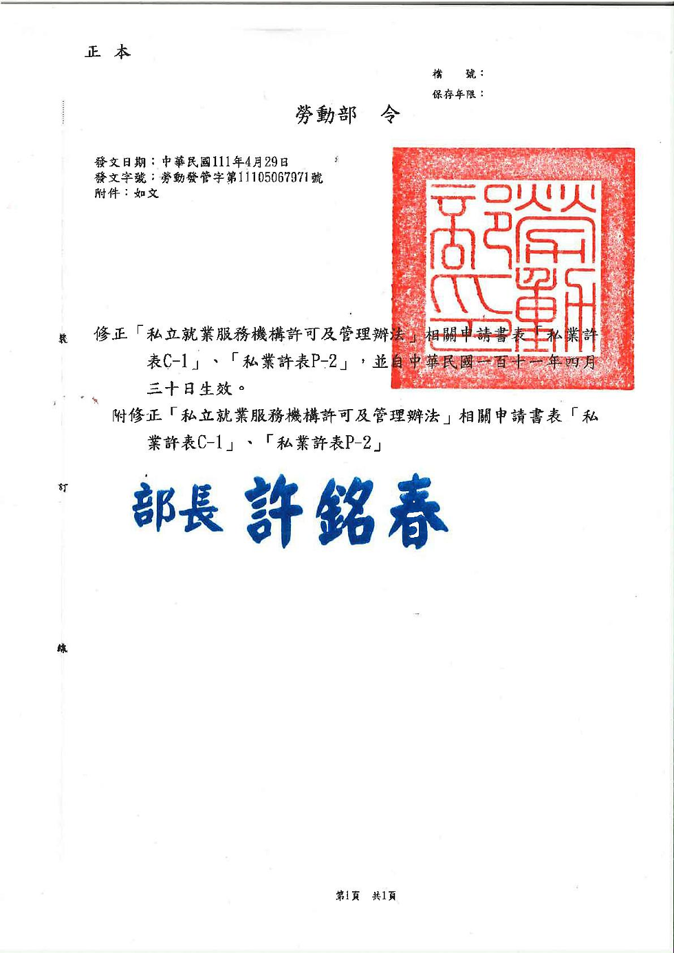 修正「私立就業服務機構許可及管理辦法」相關申請書表「私業許表C-1」、「私業許表P-2」,並自中華民國一百十一年四月三十日生效2022年4月29日讀畢需時 1 分鐘發布令pdf私業許表C-1 docxodtpdf私業許表P-2docxodtpdf資料來源:勞動部勞動力發展署